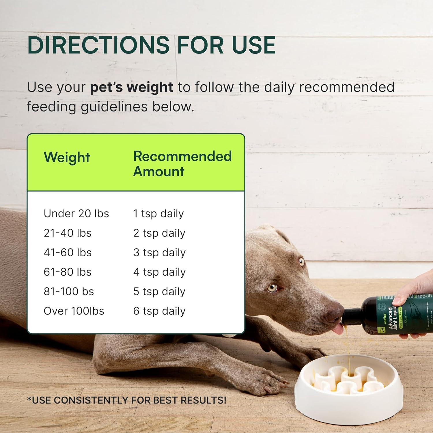 Powerful Joint Support for Dogs: Wuffes Advanced Joint Liquid is a premium dog joint supplement designed to help maintain hip and joint health, promote mobility, and support comfort – especially for senior dogs or picky eaters who prefer an easy-to-give liquid glucosamine formula.
